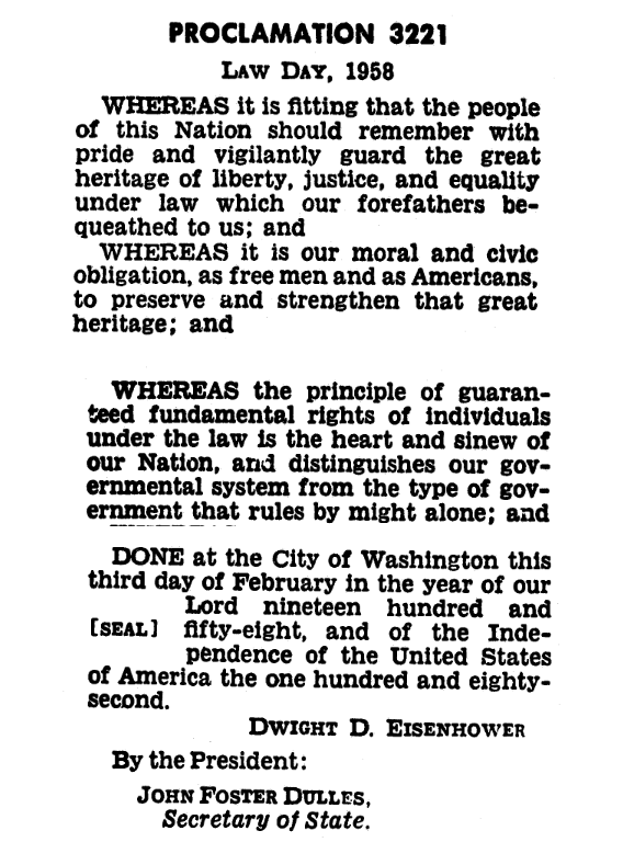 It’s May 1st, which means its Law Day….established by President Eisenhower during the tensions of the Cold War. While the Soviets commemorated May 1st as International Workers’ Day with a high profile parade featuring tanks and thousands of troops demonstrating Communism’s military strength, Law Day sought to emphasize the rule of law and liberty ensures individual freedoms….