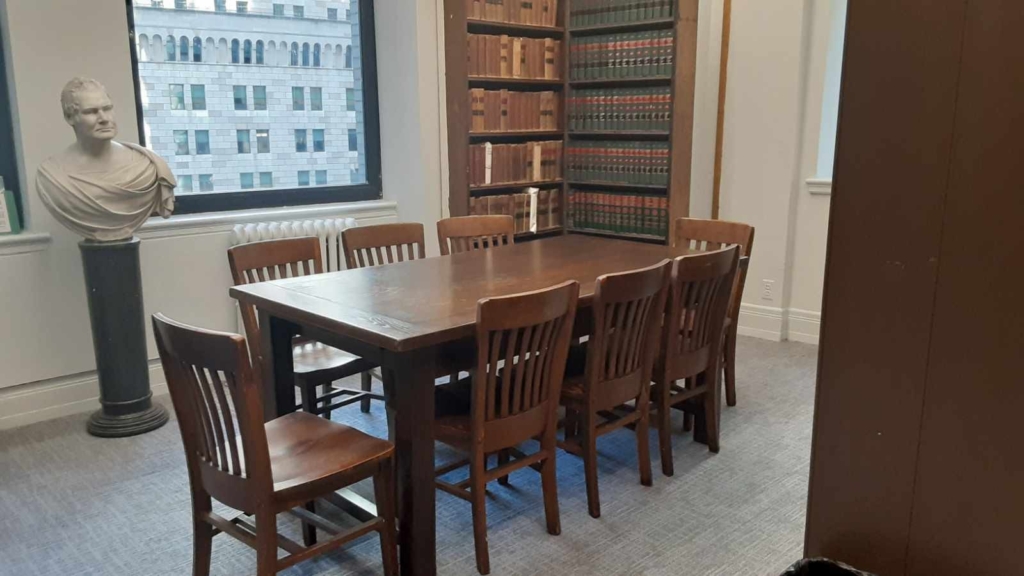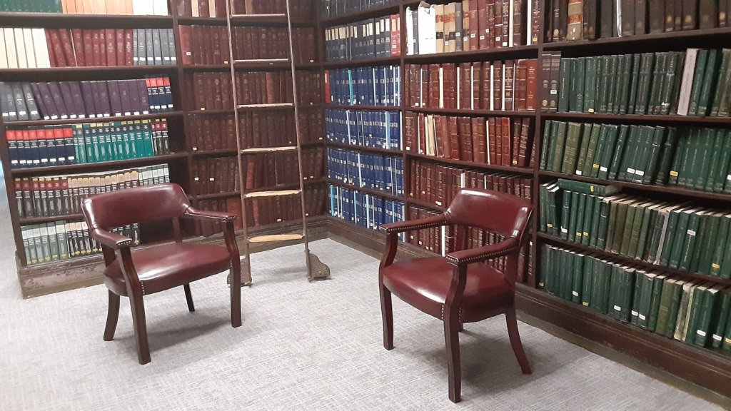 New paint and rugs, improved lighting and a completely new pantry area give us a whole new look. We’ve also gotten some snazzy entry way furniture (matching black leather chairs and couch), created a swing space office for visiting scholars and a conference area in our reading room, and — near & dear to the heart of every M.L.S. graduate — we got our microfiche, foreign collections and superseded statutes in a more logical order. As every librarian know — collections tend to grow == and then wander!!